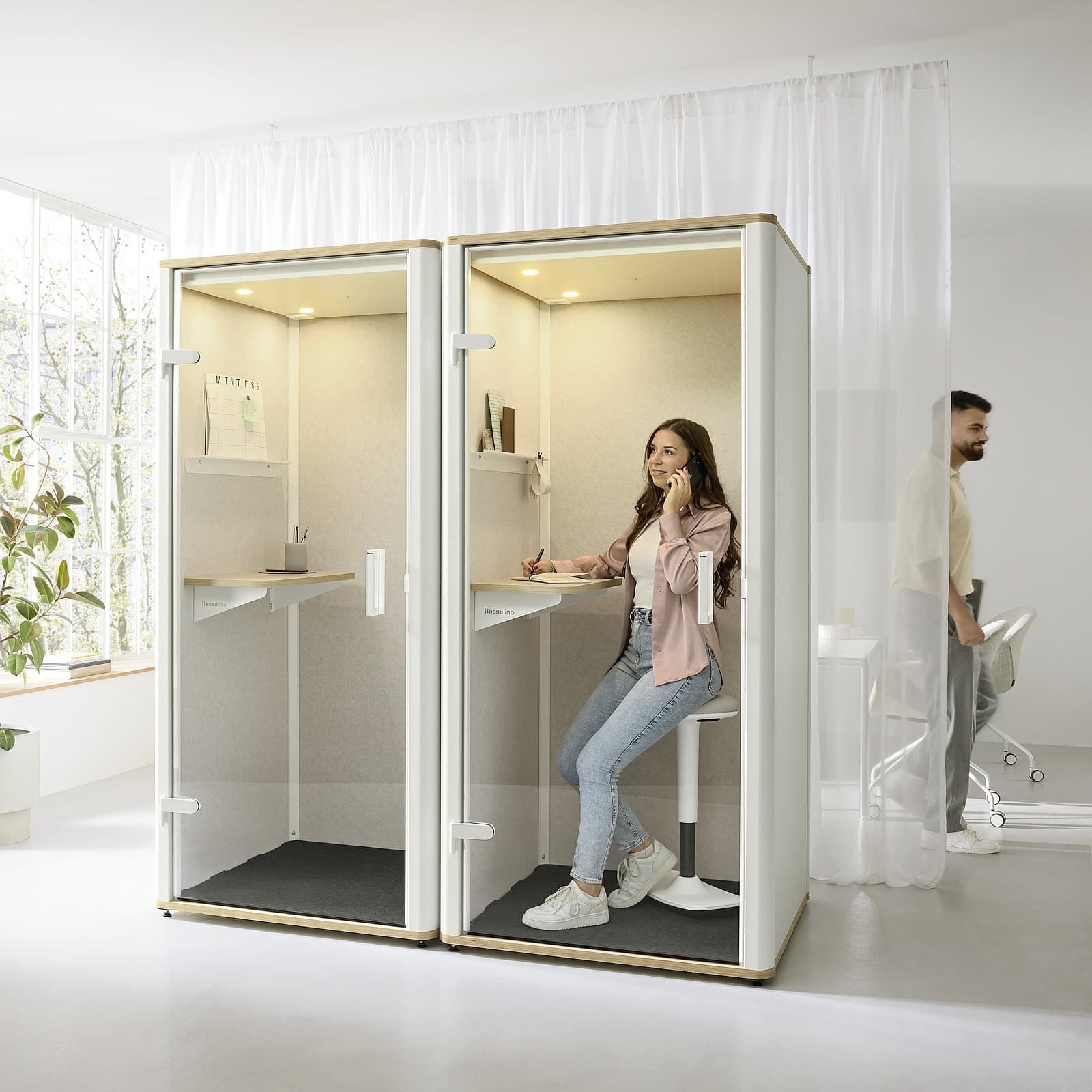 Die Telefonbox „Bosselino Uno“ ist ideal für quirlige Großraumbüros und bietet eine ruhige Rückzugsmöglichkeit für Telefonate, Video-Calls oder konzentriertes Arbeiten.